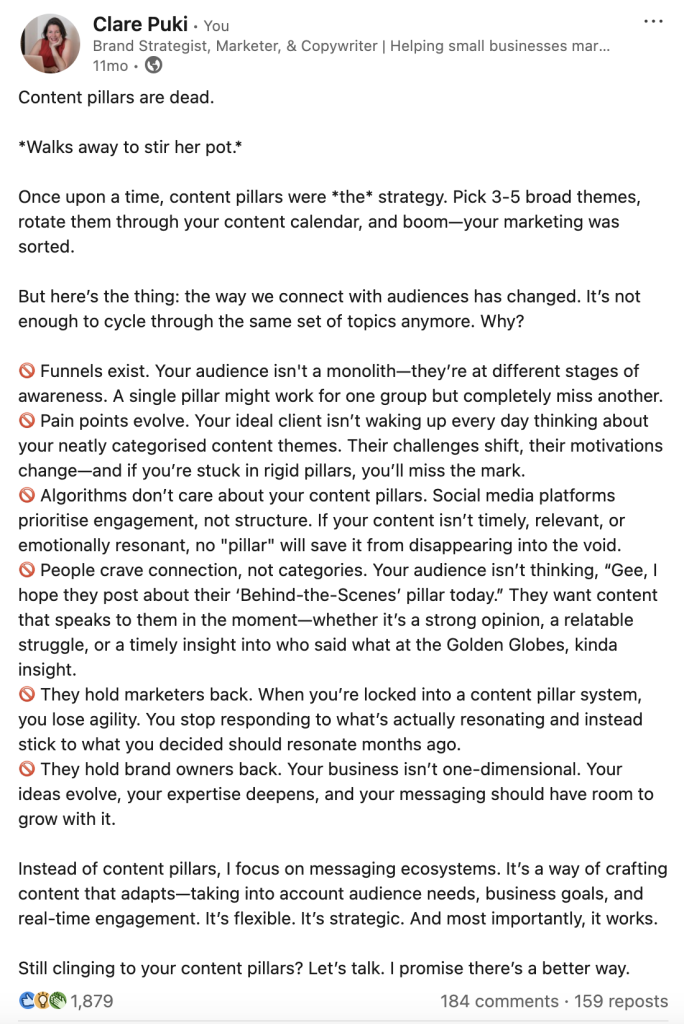 For me, this LinkedIn post that I wrote while I was on holidays not thinking much of it, blew me away with the response. I think the reason it went viral was that I took a clear stance. I didn’t hedge my bets or play it safe. I just said what I believed, and it resonated.